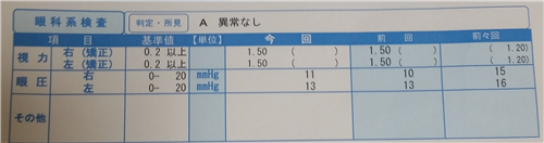 視力が(1.2)って書いてあると思うんですが、コンタクトをつけた結果はカッコの中に書かれるので、コンタクトをつけて1.2だったってことですね。